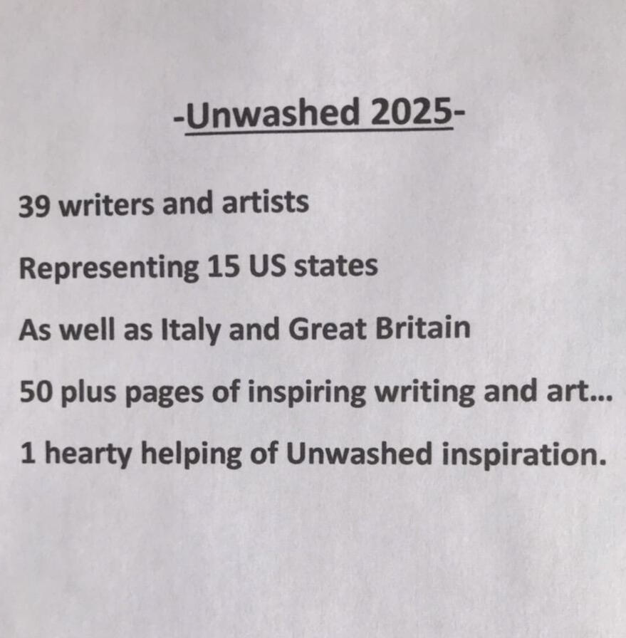 Welcome to the online home of Unwashed, a creative writing and art journal based in Bay View, Wisconsin. Unwashed is a welcoming home to both new and established writers and artists. We hope to shine a light on all creative styles, from traditional to experimental and everything in between. We place no restrictions on the subject matter that we publish, but believe that best creative work comes from the heart or the gut. The creative life is not for the faint of heart, but if you have the courage to put yourself and your work "out there," then we want to hear from you.Established in January, 2023, annual issues of Unwashed have been published in 2023, 2024, and 2025. The submission periods for new issues begin on March 1st and end with the close of May 31st. Submission guidelines are provided below. We can't wait to see what comes our way. Any questions, email us at [email protected].