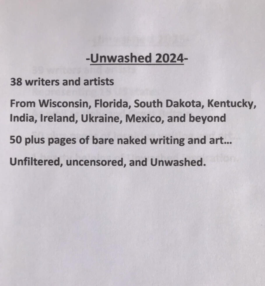 Welcome to the online home of Unwashed, a creative writing and art journal based in Bay View, Wisconsin. Unwashed is a welcoming home to both new and established writers and artists. We hope to shine a light on all creative styles, from traditional to experimental and everything in between. We place no restrictions on the subject matter that we publish, but believe that best creative work comes from the heart or the gut. The creative life is not for the faint of heart, but if you have the courage to put yourself and your work "out there," then we want to hear from you.Established in January, 2023, annual issues of Unwashed have been published in 2023, 2024, and 2025. The submission periods for new issues begin on March 1st and end with the close of May 31st. Submission guidelines are provided below. We can't wait to see what comes our way. Any questions, email us at [email protected].
